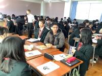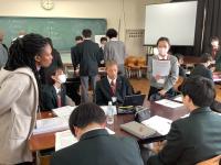 本日、第1学年を対象にインターナショナルデーを実施しました。JICAから12名の研修員の方にご来校いただき、第1学年6クラスを3クラスずつ実施。1クラスにつき4名の研修員さんに参加していただき、グループごとにさまざまな活動を行いました。